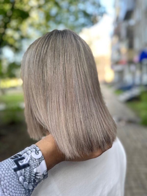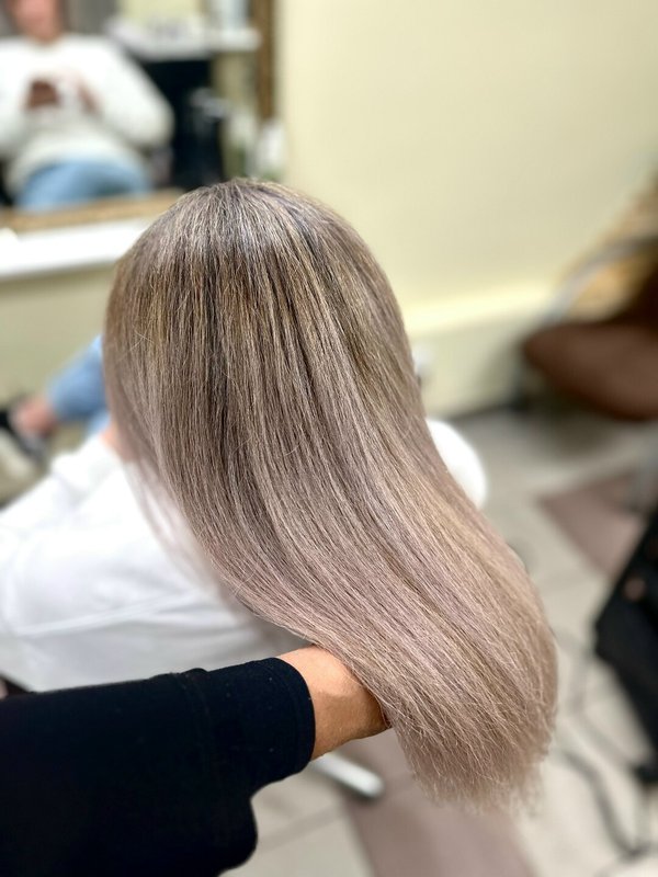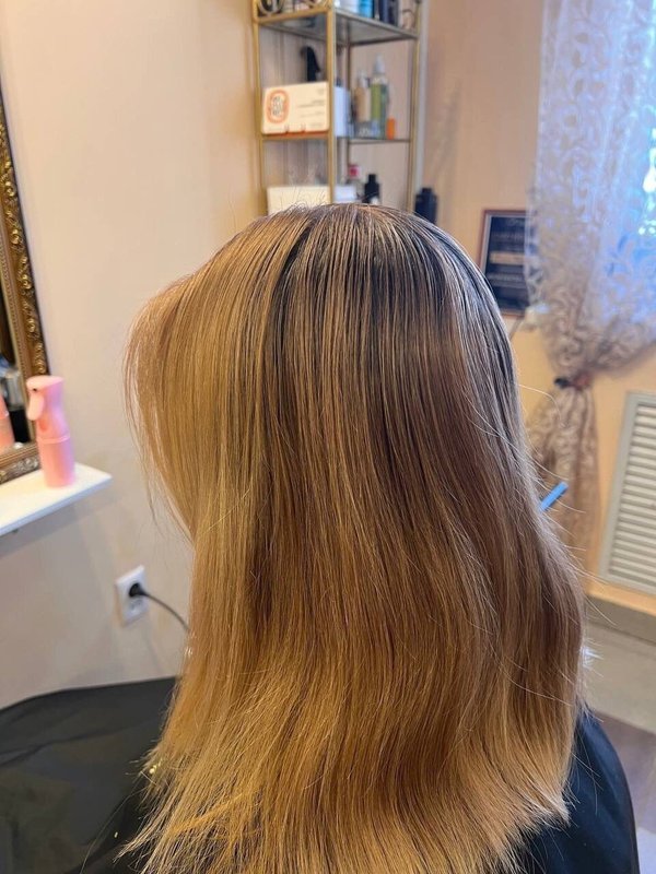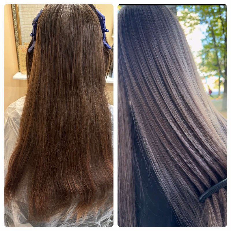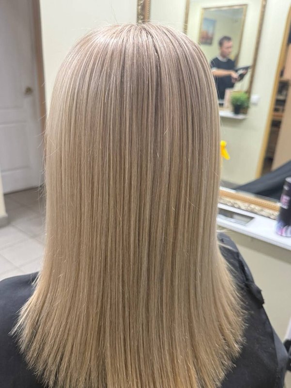 Николай исправил неудачное предыдущее окрашивание от постороннего "мастера", полностью попал в желаемый оттенок, сделал мягкий переход от корней волос к основной длине и красивую укладку)